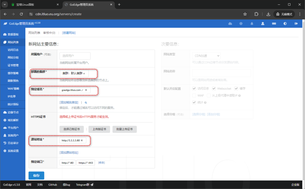 点击 网站列表 -> 创建网站 选择集群,填入域名、源站地址等信息(其他配置视情况而定)点击保存