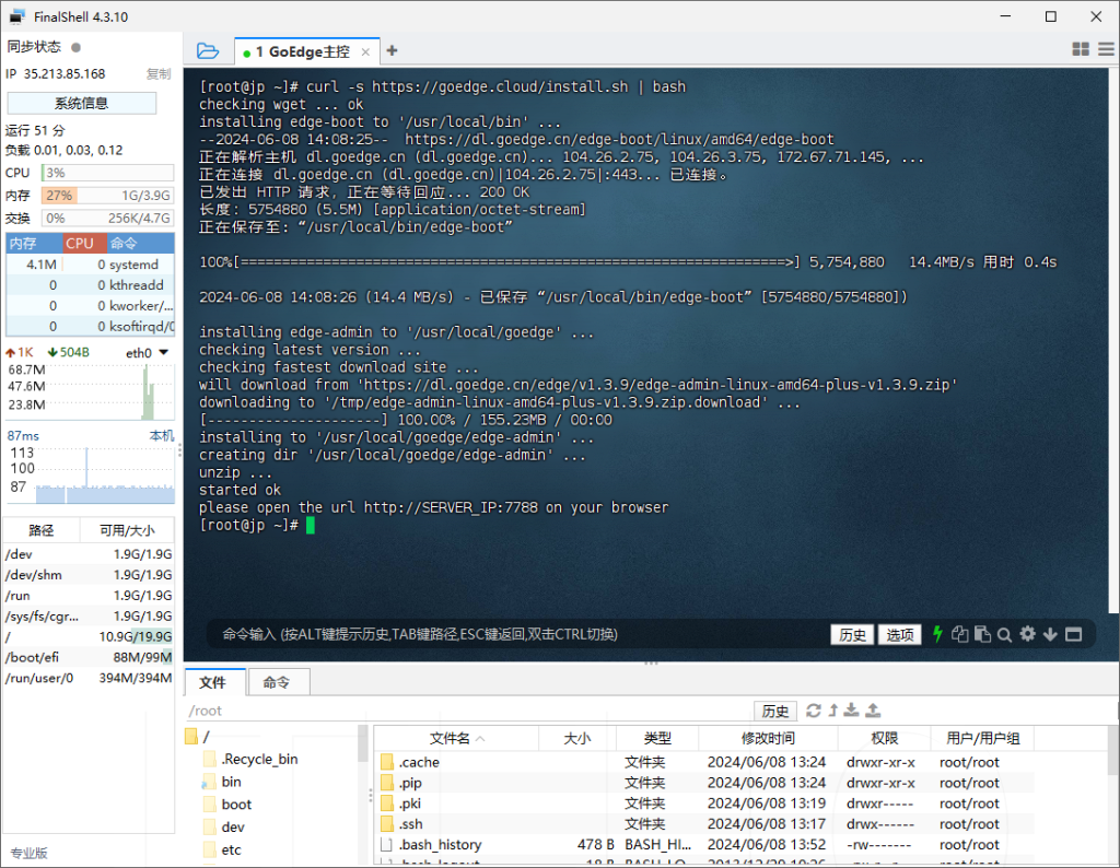 可以使用 install.sh 快速安装GoEdge管理平台,目前仅限于Linux系统;在你的系统上运行以下命令(需要你的系统已经安装 curl 和 wget 命令,非root用户请使用sudo执行):