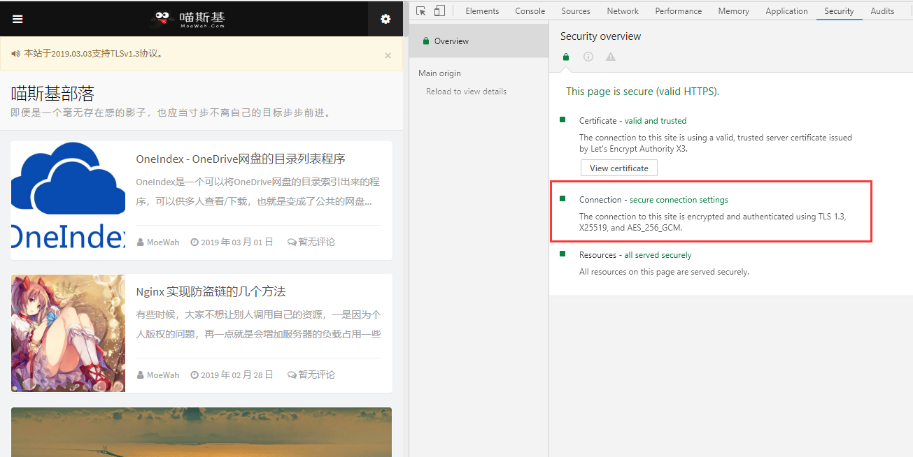△ 上图显示在 Chrome 浏览器测试通过,已成功启用 TLS1.3