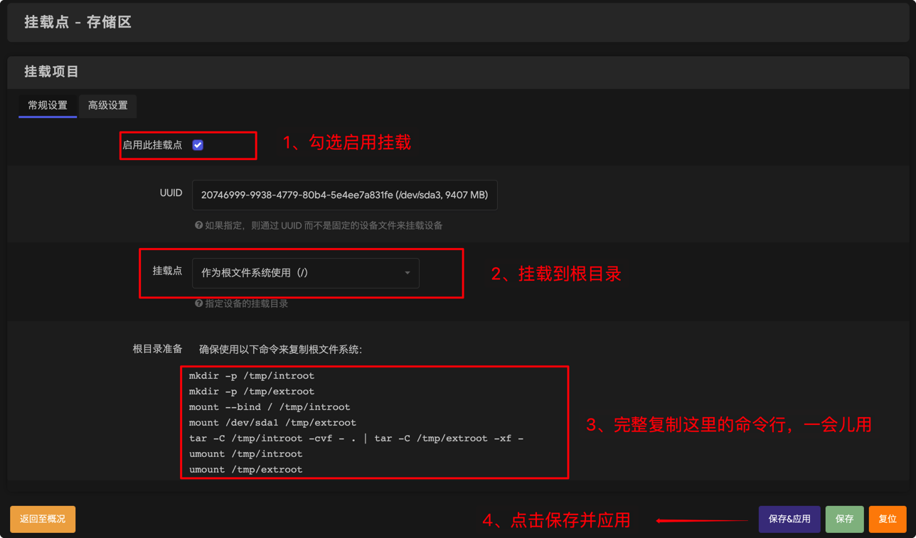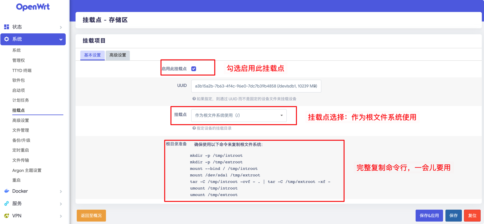 勾选 启用此挂载点,挂载点 选择为 作为根文件系统使用 ,完整复制根目录准备中的所有命令行后,点击 保存并应用。