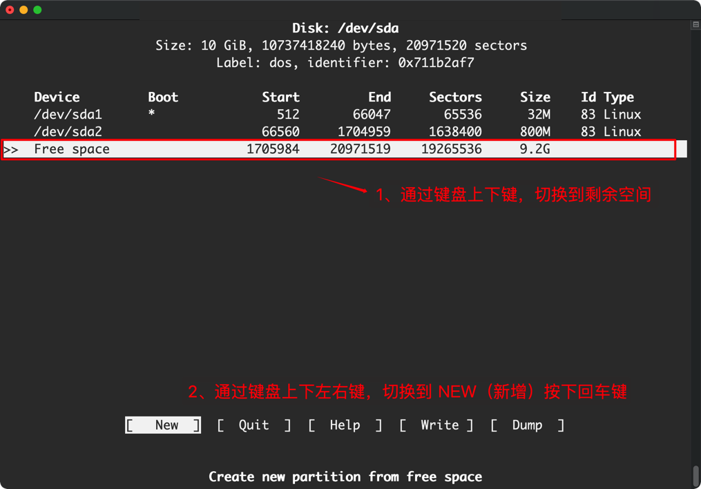 SSH 终端运行 cfdisk 命令进入磁盘分区界面,通过键盘上下键切换到 Free space (剩余空间),左右键切换至 NEW (新增分区),然后按下回车键。