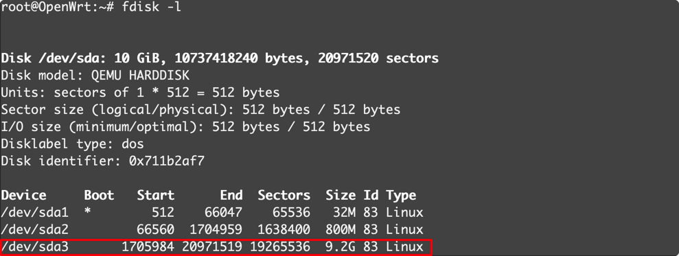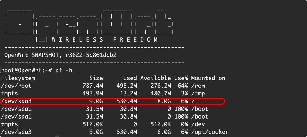 SSH 终端连接 OpenWrt,运行下面命令查看磁盘信息
