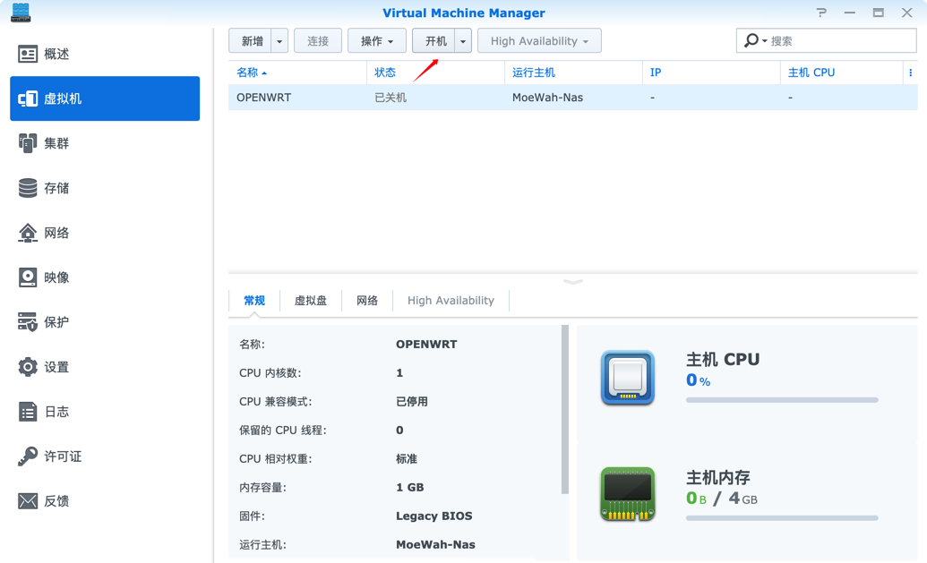 回到 虚拟机 ,点击已停止运行的 OpenWrt 虚拟机,执行 开机 操作。