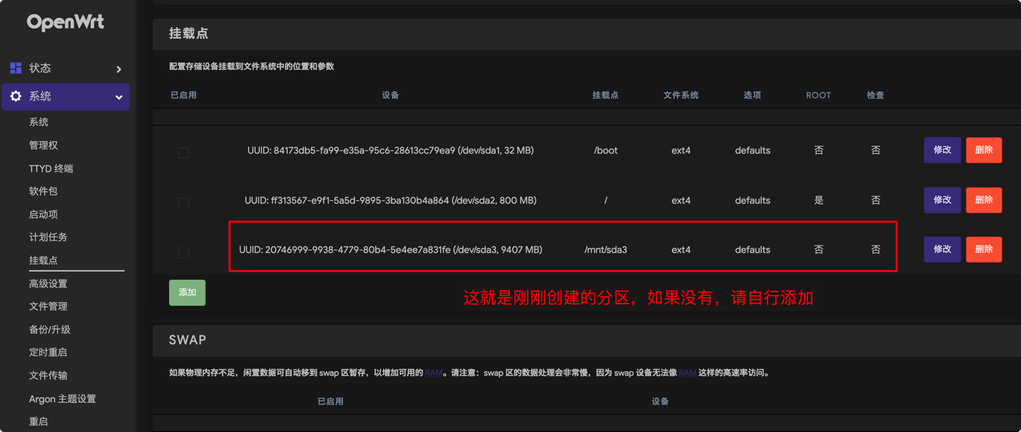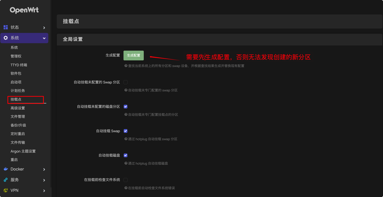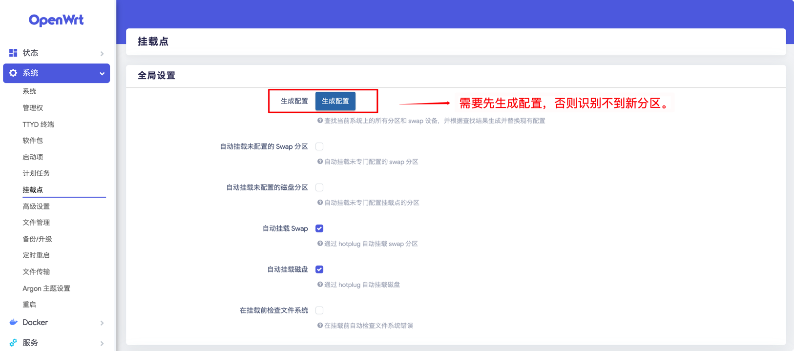 进入 OpenWrt 管理后台,依次点击 系统 - 挂载点 找到并点击全局设置中的 生成配置 。