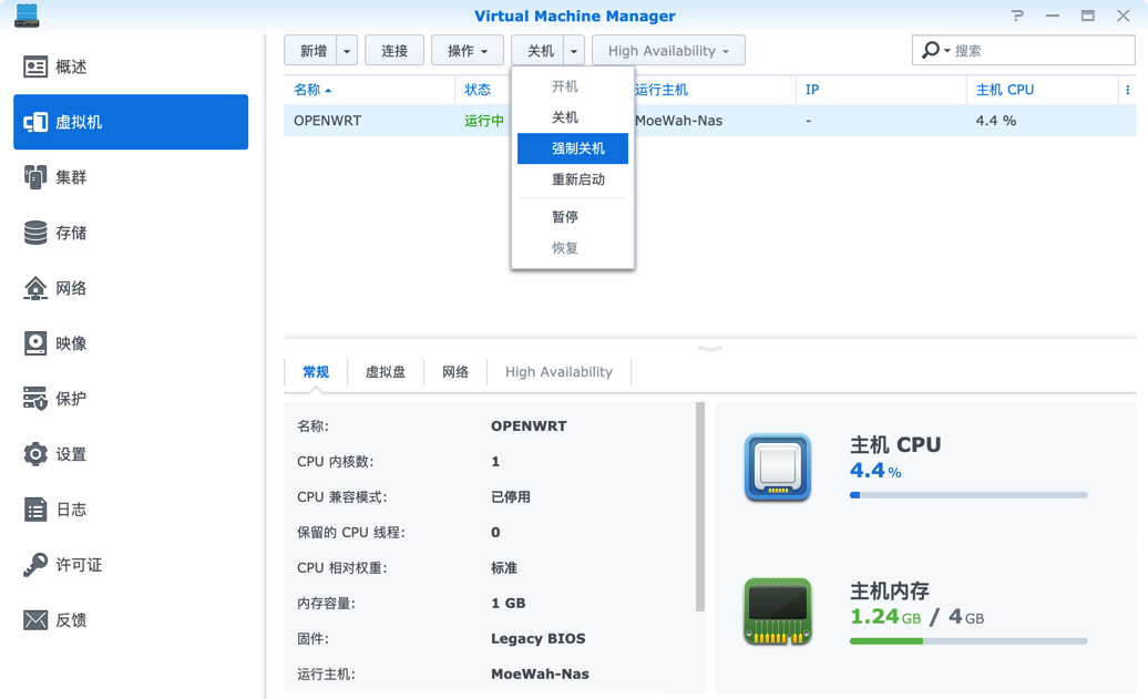 打开群晖 VMM 找到正在运行的 OpenWrt 虚拟机,选择 关机 - 强制停止。