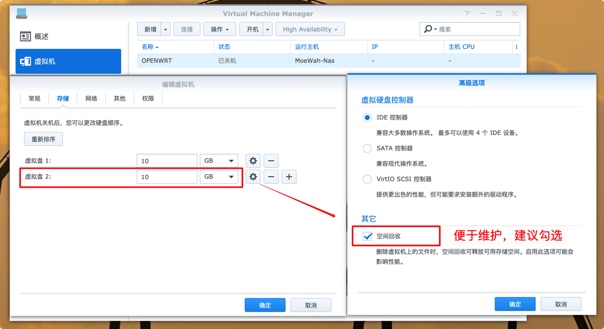 在 虚拟机 中找到已经停止运行的 OpenWrt 虚拟机,依次选择 操作 - 编辑,找到 存储 设置项,自定义磁盘空间大小(例如 10GB),点击 + 号,新增一块磁盘,例如 虚拟盘 2 (建议勾选空间回收),点击 确定 保存设置。