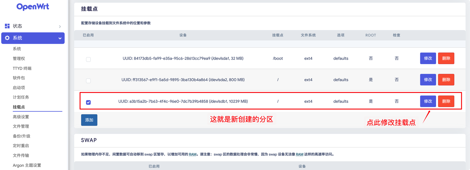 在 挂载点 找到创建的新分区,点击 修改 重新调整挂载项目的设置。